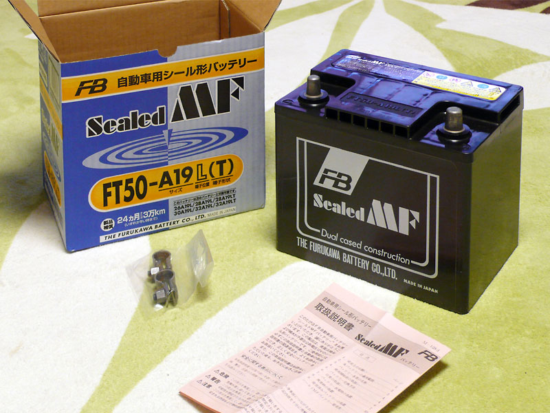 普通の車ならバッテリーの容量はアップする方向で交換したりしますが、こういう車なのであえて更に小型軽量化してみようと思います。 容量は少ないですが R34 GT-R などに使用されているのと同じものなので、始動性に問題は無さそうです。 純正が 34B19L という大きさで、たぶん 24Ah 程度の容量だと思いますが、FT50-A19L(T) は 17Ah なので約 30% ダウンと言うことになります。本当に大丈夫かな?・・・後で暗電流を測定してみようと思います。 このバッテリーの重量は実測で 6.6kg なので、純正に比べて 1.4Kg 軽量ということになります。