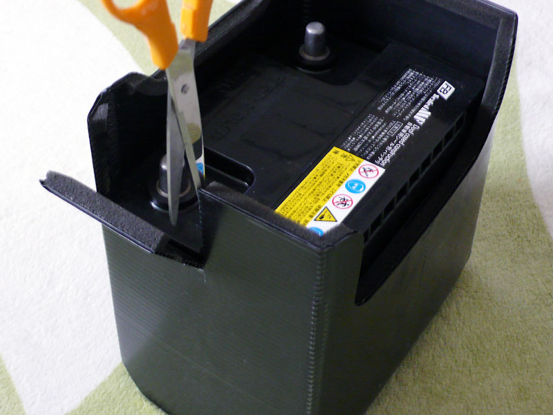 FT50-A19L(T) の幅と奥行きサイズは純正バッテリーと同じですが、高さが約 50mm 低いため、そのままではターミナルやバッテリークランプがカバーに干渉してしまいます。