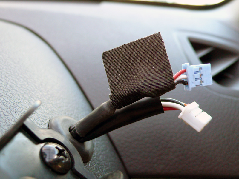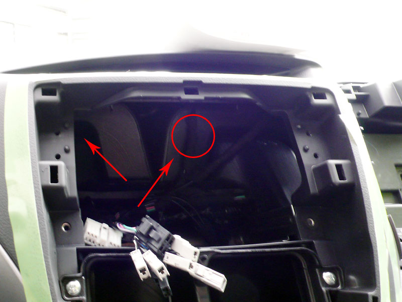 異音:カタカタ ナビを付けていて気がついたのですが、ダッシュボード中央のマルチインフォメーションディスプレイに伸びる配線コードが赤丸印の中と写真では見えていないですが左矢印の奥の2本あります。このコードが無造作に転がされており、段差などでカタカタという音が出ます。 これら2本のコードをエプトシーラーで巻いて音が出ないようにしました。