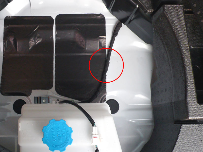 異音:ビシッ! インプレッサはトノカバーから音が出ると良く聞きますので、それかと思って調べましたが、トノカバーはちゃんと異音対策されているようで、実際ここから異音は出ていません。 よく調べてみると、インタークーラーウォータースプレー用の水タンクの配管がフロアーの鉄板に当たって出ていることが判明しました。 配管は固定されずに転がっているだけでしたので段差など結構大きな高い音が出ていました。 この配管もエプトシーラーを巻いて処理しました。またフロアにもスポンジシートを貼ってみました。