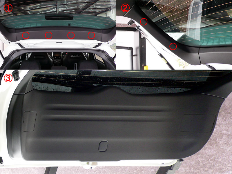 異音:カタカタ ここもいつかは出るだろうなと思っていた場所ですが、早速カタカタ音が出始めました。 縦に付いている左右2本の内、助手席側から音が出始めたのですが、予防も兼ねて一度全て外して対策しようと思います。 この内張もビスが1本も使われていません。全てクリップで固定されているだけですので、写真の1〜3の順で内張を外します。 ピラー部分のクリップの位置はおおよそ写真の○印の場所です。ゲートの内張はクリップが多すぎるため明記していませんが、隙間に手を入れて一気に引っ張ればバキッと音がして外れます。