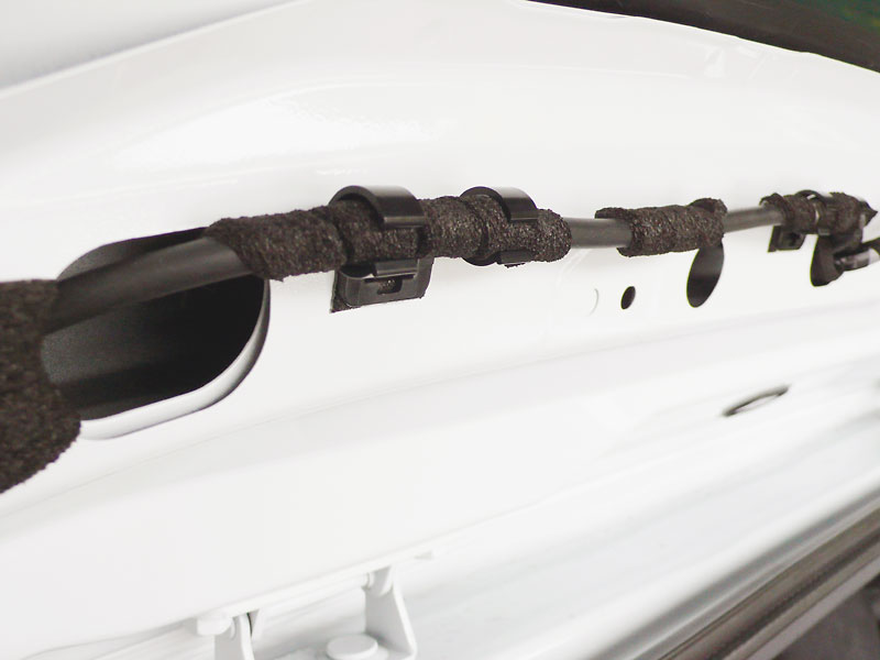 異音:カタカタ、ビリビリ エンジンルーム内の異音がダッシュボード内から出ているように聞こえる事があります。 今回調べてみるとウィンドウウォッシャー用の配管の繋ぎに使用されているプラスチックの継ぎ手がボンネットの蓋に当たっているようでしたので、エプトシーラーを巻いて対策しました。この継ぎ手は左右に1個ずつあります。また、配管が長い場所は中間部分で配線コードの留め具など使用して固定しました。 また、ホースを固定している白い留め具も共振してビリビリ音が出ているようです。一度外してエプトシーラーを挟み込んで対策しました。