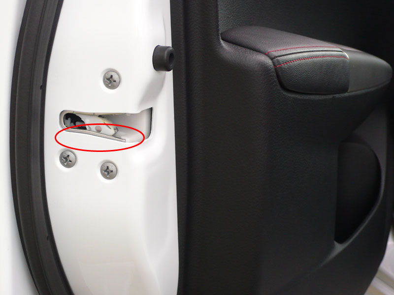 異音:チリチリ 助手席側Bピラーの上の方でチリチリ音がしており、ドアを押したりウィンドウを上げ下げすると音が変化します。 Bピラーの回りやドアの内張をチェックしてもなかなか場所が特定できなかったのですが、結局原因はドアロックソレノイドの取り付け部分でした。 金具とボディーパネルが微妙にずれて音が出ているようです。分解して対策するのが面倒くさかったので隙間にスプレー油を塗布して対策しましたが、 ボディー側のフックも同時に処理したため、もしかしたら原因はフックの方だったのかもしれません。 油を塗っただけなので1年位したら再発する可能性もありますが、その時はまたスプレー油を塗布しておこうと思います。
