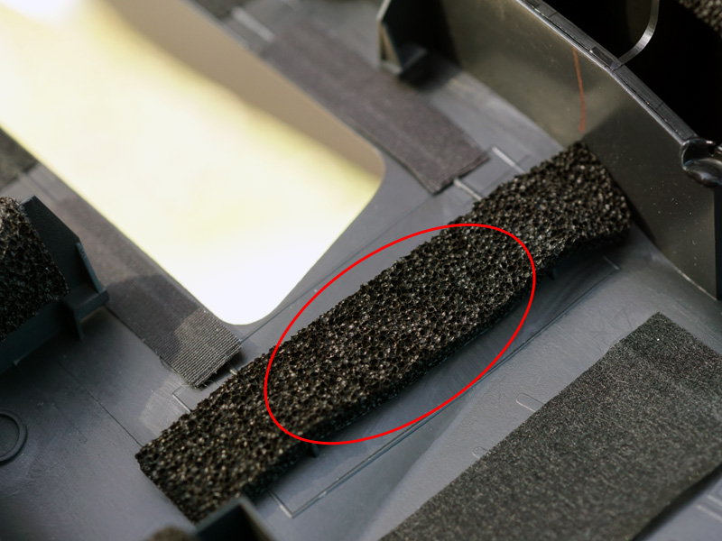 もともと薄いテープが貼られていてそれなりに対策はしてあるのですが、十分では無いようです。上下2ヵ所薄いテープが貼ってある位置を対策します。 念のため内貼りがボディーに当たっている部分も対策して、組み付けます。