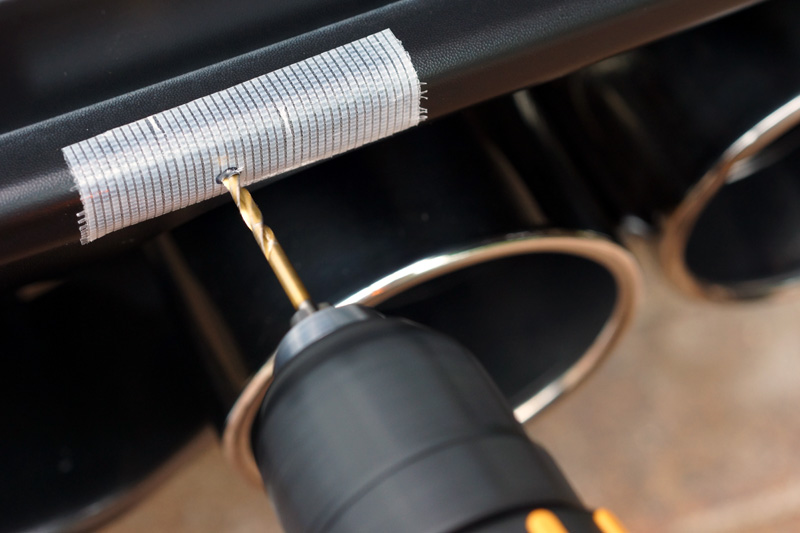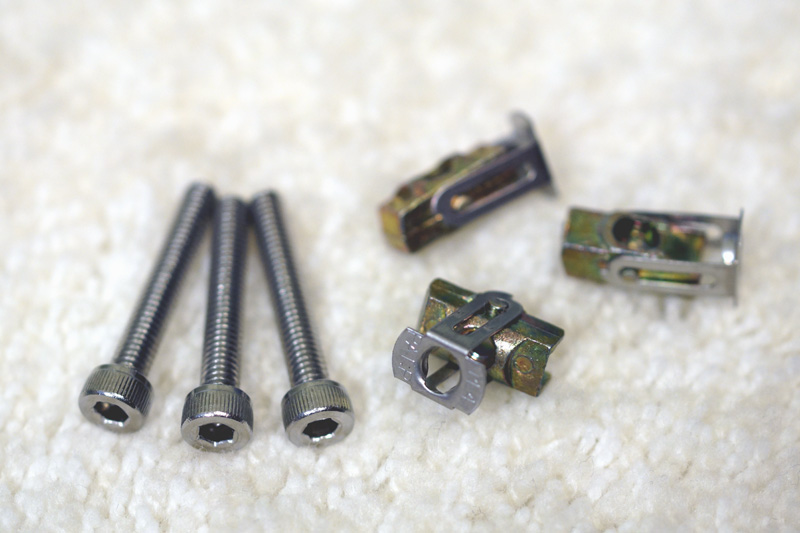 バンパーを外すとなるとリアアンダースポイラーも外す必要があり、とても面倒くさいので、ターンナットと六角穴付ボルトを使用して取り付けることにします。 本当は付属の低頭ボルトを使用した方が格好良いのですが、純正ボルトは M5 という中途半端なサイズで、ターンナットが見つかりませんでした。 ターンナットは M4 のものを使用して、代わりに普通のステンレス製六角穴付ボルトを使用します。