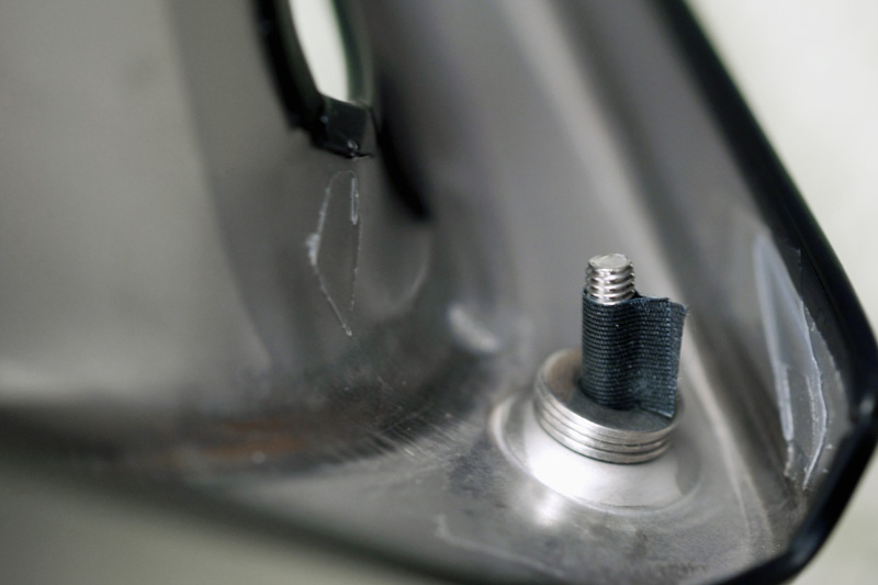 六角穴付ボルトは頭の直径が小さいので、ワッシャーも使用します。純正は緩まないようロックナットが付属していますが、これが使用できないためナットに瞬間接着剤を少量染み込ませて緩み止め代わりにします。