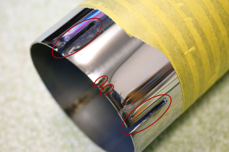切り込みは左側のパイプは3時の位置を中心として上下に、右側のパイプは9時の位置を中心として上下にそれぞれ入れます。これを2組(計4個)つくります。 |