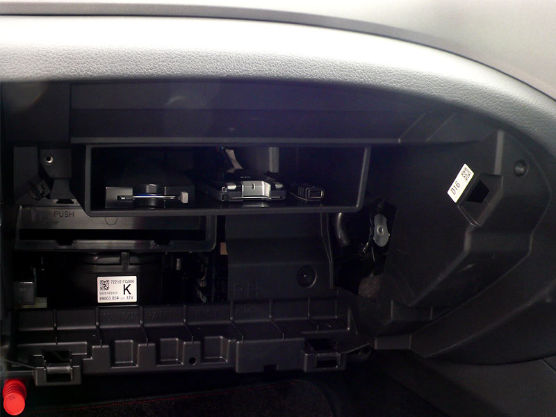 地デジ用の B-CAS カードリーダーと USB メモリーカードリーダーは、グローブボックス内の車検証入れに設置しコード類を綺麗に隠ぺいします。