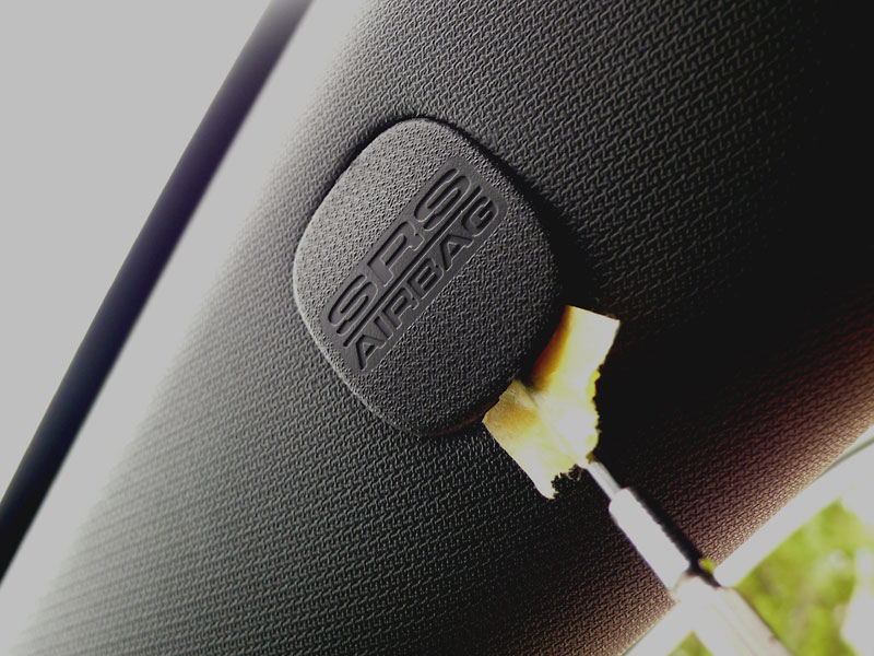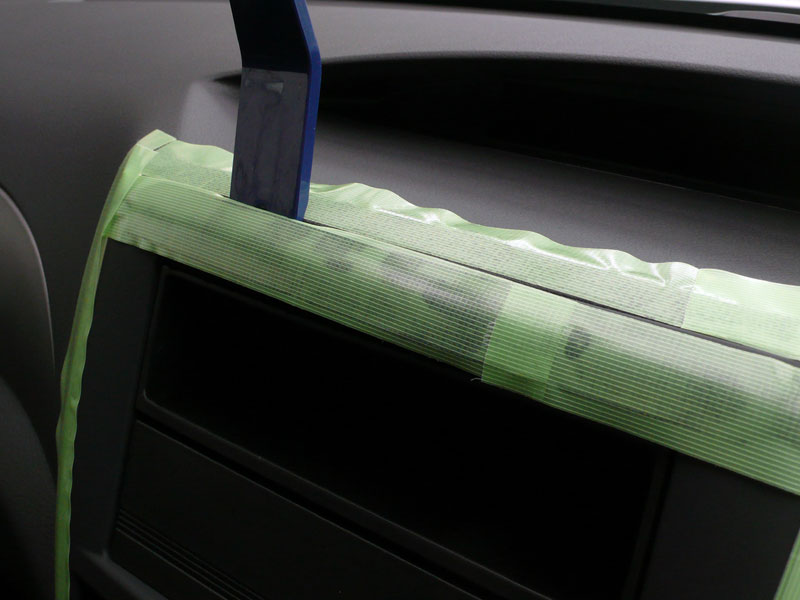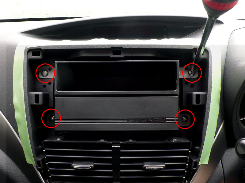 このパネルはクリップで固定されているだけなので傷が付かないようマスキングして、写真の位置から少しずつ内装剥がし等を押し込んでいくと外れてきます。 インプレッサの内装はとても傷が付きやすいため、マスキングしてから慎重に作業します。