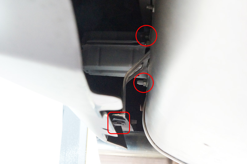 バンパー裏を覗いてみると、取り付け場所のナット2箇所は見えています。(○印の位置)