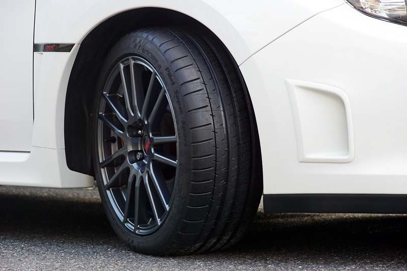 ミシュランの Pilot Super Sport (パイロット・スーパー・スポーツ)です。 このタイヤは STI のコンプリートカー S206 に採用さている事(あっちは 19 インチですが・・)、そして何より軽いというのが決め手になりました。